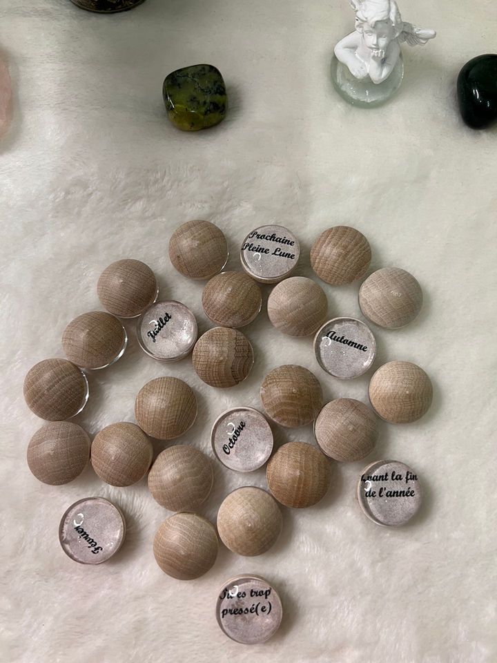 Il se compose de 40 pièces, dimensions 20mm avec un recto porteur des mêmes notions de temps que l’oracle initial et d’un verso en bois naturel.